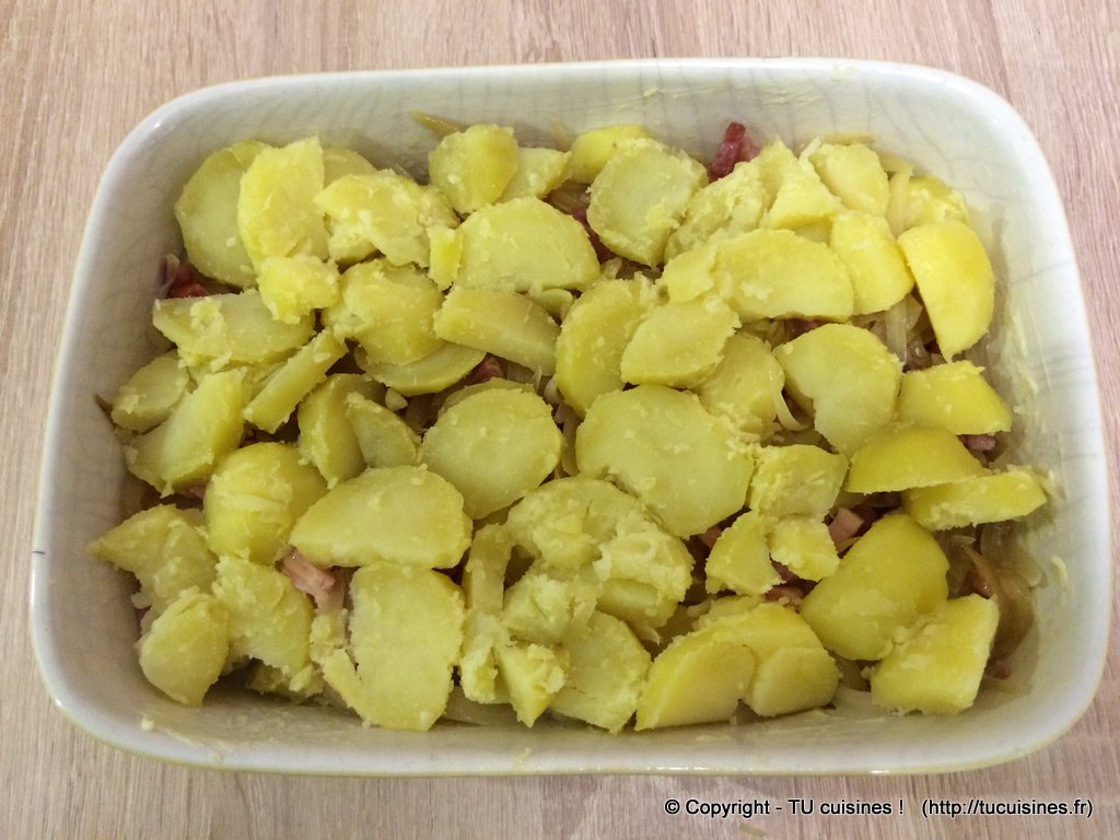 4. Garnis le plat à gratin avec 2 couches de pommes de terre + lardons/oignons