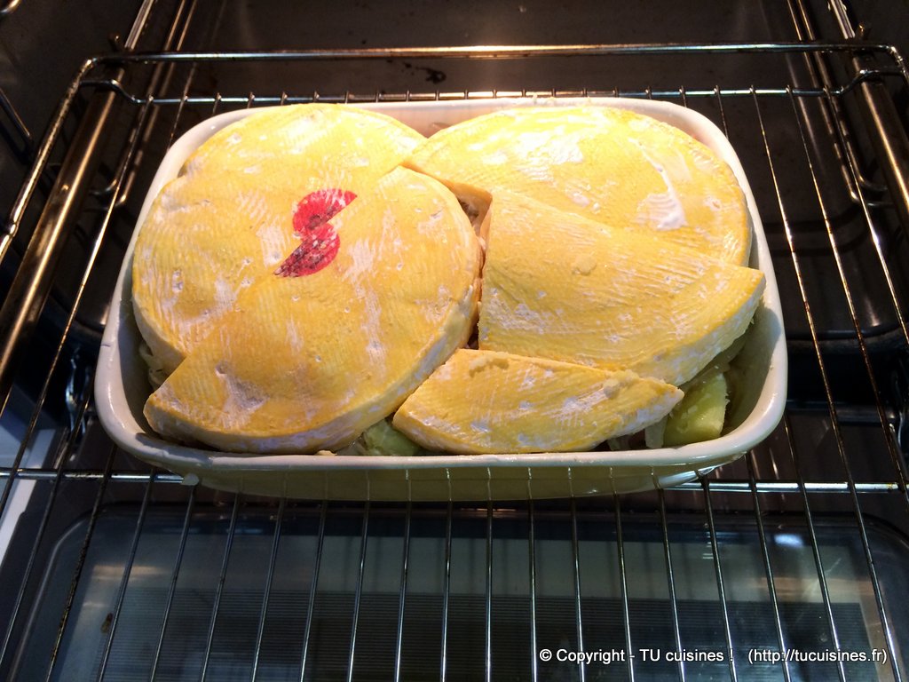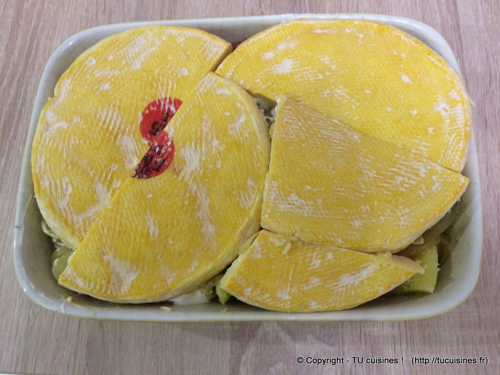 4. Pour finir, dépose les morceaux de reblochon sur le dessus du plat, traditionnellement avec la croûte sur les pommes de terre et la chair en haut, mais je préfère personnellement avec la croûte en haut et la chair contre les pommes de terre.