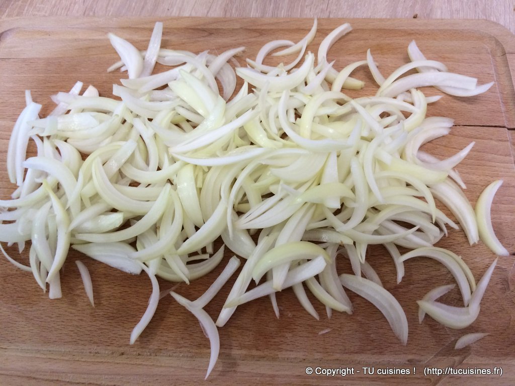 1. Pendant la cuisson des pommes de terre, émince 2 oignons en fines lamelles.