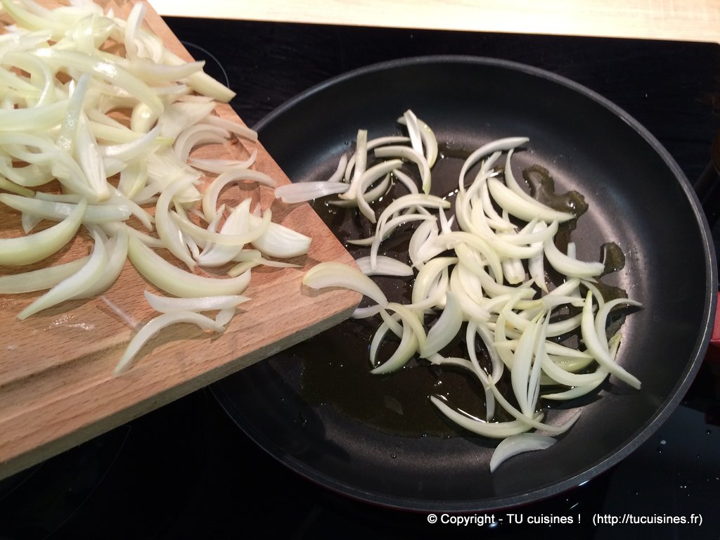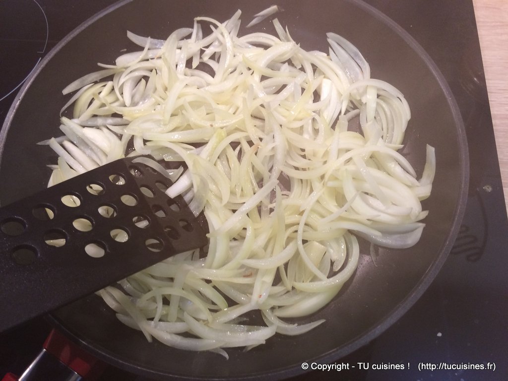 3. Fais revenir les lamelles d'oignons dans un peu d'huile d'olives 5 minutes environ à feu moyen en remuant très souvent, jusqu'à ce qu'il deviennent légèrement translucides.